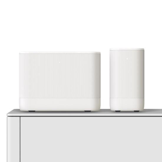 The Vodafone home broadband WiFi 6 PowerHub router sitting next to a range extender on top of a cabinet