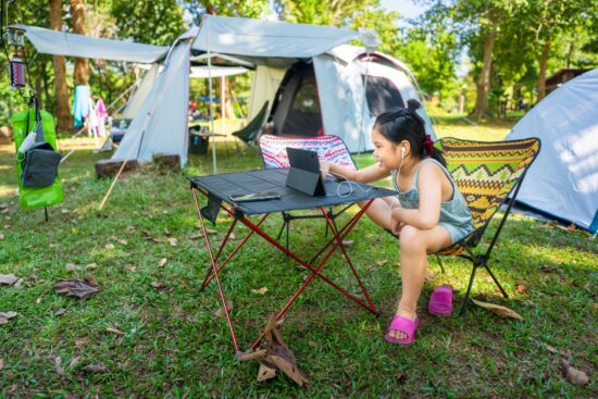 Young girl on tablet computer next to tent