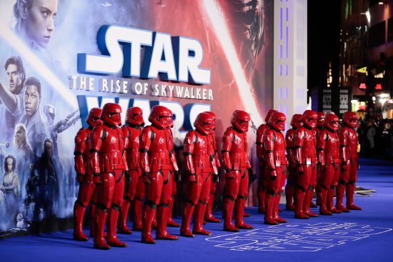 Stormtroopers in red uniforms lined up against Star Wars: The Rise of Skywalker poster